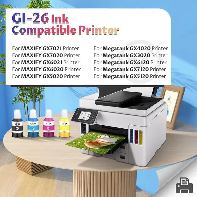 Compatible Printer, GI-26 GI26 GI 26 Ink refill bottles compatible with Canon maxify GX4020 Printer, compatible with Canon maxify GX5020 printer, compatible with Canon maxify GX6120 printer, compatible with Canon maxify GX7021 printer, compatible with Canon maxify GX7120 printer, compatible with Canon maxify GX6020 printer, compatible with Canon maxify GX6021 printer, compatible with Canon maxify GX7020 printer,, compatible with Canon maxify GX3020 printer