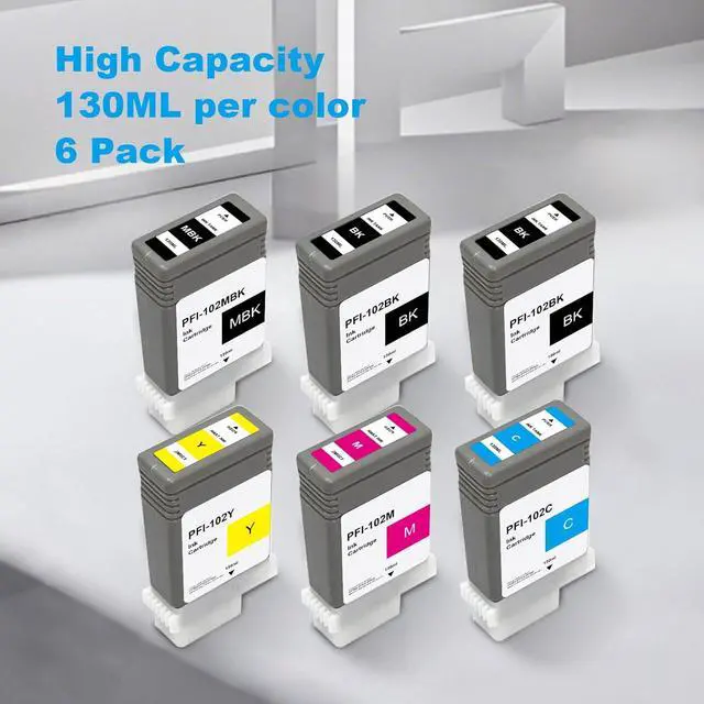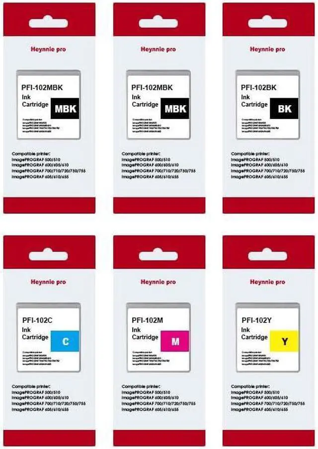 Includes: 6-Pack, PFI 102 Ink Cartridge Set (2 Matte Black, 1 Black, 1 Cyan, 1 Magenta, 1 Yellow)