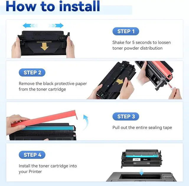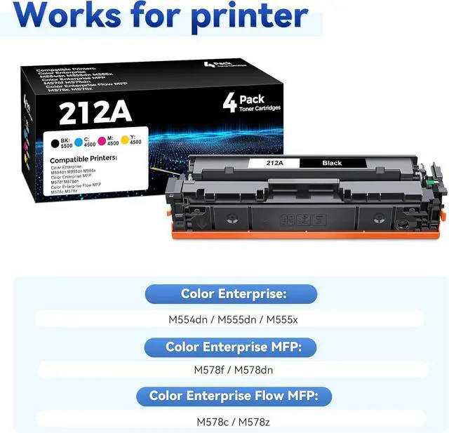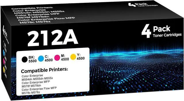 Package Content: 4 packs compatible with HP 212a toner cartridge set. include 1 x 212a black toner cartridge (W2120A), 1 x 212a cyan toner cartridge (W2121A), 1 x 212a yellow toner cartridge (W2122A), 1 x 212a magenta toner cartridge (W2123A)
