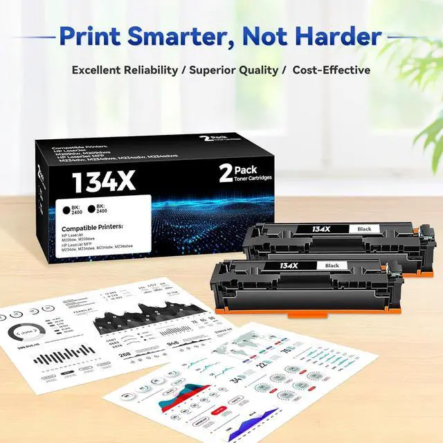 Set Contents: 2 packs of 134X black toner cartridges compatible for HP printer and user guide.