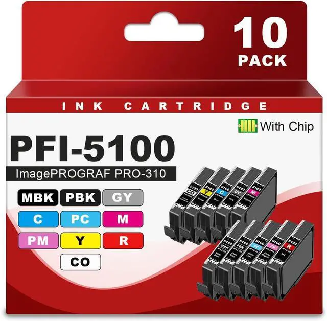 Package Contents: 10 pack PFI-5100 Ink Cartridges, Matte Black, Photo Black, Cyan, Magenta, Yellow, Red, Gray, Photo Cyan, Photo Magenta, Chroma Optimizer