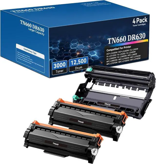 Package contents: 2X TN660 black toner cartridge, 1x drum unit DR630 (packaging version may vary).