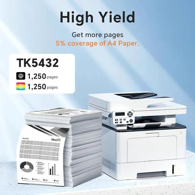 High Page Yield:1250pages per TK-5432 Black Toner Cartridge,1250 Pages per color toner cartridge. At 5% coverage (A4/letter)
