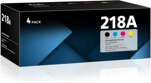 Package contents: 4-Pack 218a toner cartridges set with chip for 1x 218A Black toner-W2180A, 1x 218A Cyan toner-W2181A, 1 x 218A Yellow Toner-W2182A, 1 x 218A Magenta Toner-W2183A