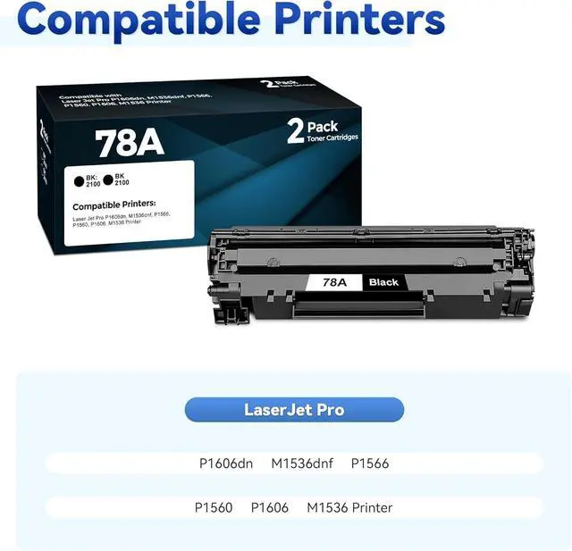 What's in the box: 2-Black 78A toner cartridges compatible for hp 78a ce278a black toner cartridges