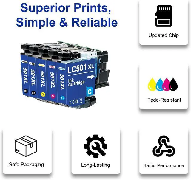 PACKAGE CONTENTS 2×LC501XL Black Ink Cartridge, 1×LC501XL Cyan Ink Cartridge, 1×LC501XL Magenta Ink Cartridge, 1×LC501XL Yellow Ink Cartridge