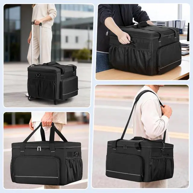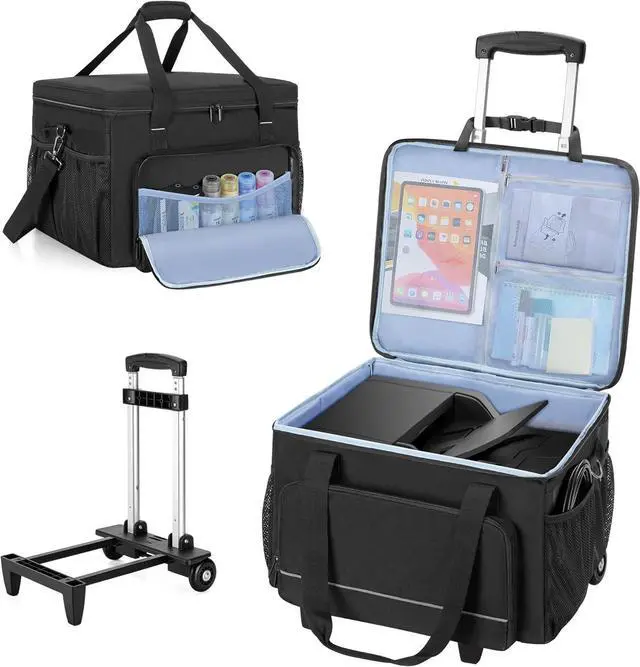 DETACHABLE HANDCART: Features an aluminum telescopic handle and smooth, silent wheels. The rolling printer case extends up to 36 inches to suit most users. Choose from 4 carrying options: padded handles, side handles, a detachable shoulder strap with metal buckle, or trolley mode