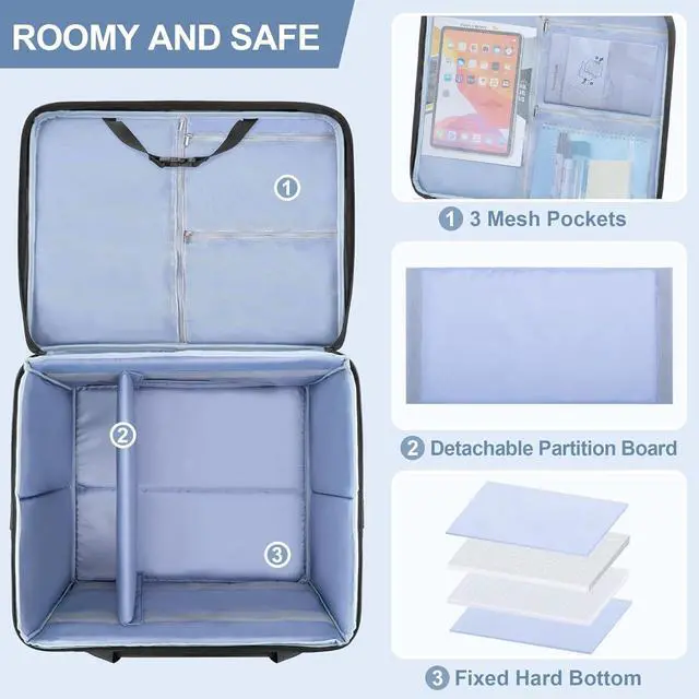 MULTI POCKETS: 3 zipper pockets on the top of the bag are suitable for storing iPad, pens, manual and other accessories. 1 large front pocket is great for document or stationery. 4 side mesh pockets fit power cords and other gadgets
