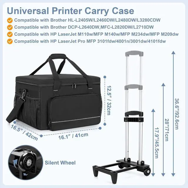 DIMENSIONS: 16.5 x 16.1 x 12.5 in. Compatible with Brother*HL-L2405W/L2460DW/L2480DW/L3280CDW, DCP-L2640DW, MFC-L2820DW/L2710DW. Compatible with HP* LaserJet M110w/MFP M140w/MFP M234dw/MFP M209dw, LaserJet Pro MFP 3101fdw/4001n/3001dw/4101fdw. *NOTE: Yarwo storage bag is not related to brand referred