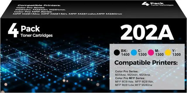 Package Contents: 4-Pack 202A CF500A Toner Cartridge with chip. 1-Pack 202A black toner cartridge (CF500A), 1-Pack 202A cyan toner cartridge (CF501A), 1-Pack 202A yellow toner cartridge (CF502A), 1-Pack 202A magenta toner cartridge (CF503A)
