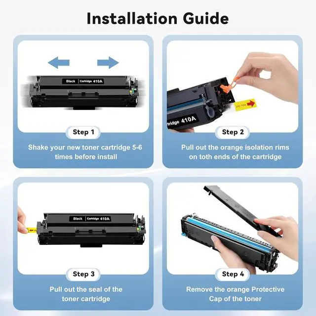 Package Include: 4-pack of 410A toner cartridges with chips, including 1x 410A black toner cartridge(CF410A), 1x 410A cyan toner cartridge(CF411A), 1x 410A yellow toner cartridge(CF412A), 1x 410A magenta toner cartridge (CF413A)