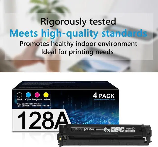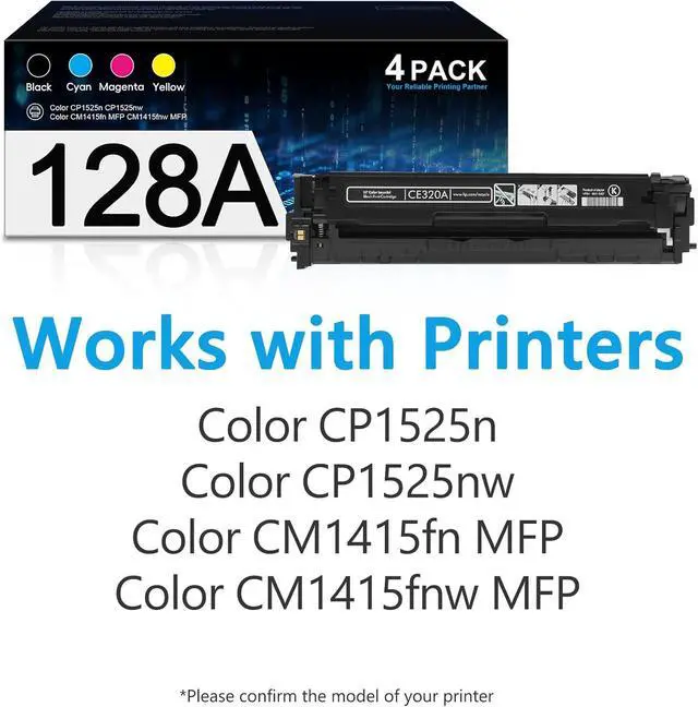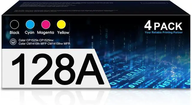 Package Content (Total 5 Cartridges)This set includes 1x Black 128A CE320A, 1x Cyan 128A CE321A, 1x Yellow 128A CE322A, 1x Magenta 128A CE323A toner cartridge, and an additional Black 128A CE320A