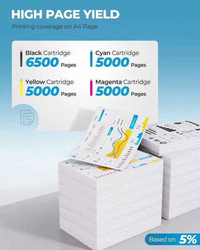 Estimated Page Yield: Up to 6500 pages per 410X Black toner cartridge, 5000 pages per 410X color toner cartridges (Cyan, Magenta, Yellow) at 5% coverage (Letter/A4)