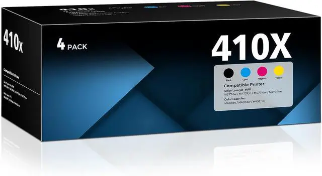 Package Contents: 4-Pack 410X toner cartridges with chips compatible for HP 410X HP410X toner cartridges (1x CF410X Black toner, 1x CF411X Cyan toner, 1x CF412X Yellow toner, 1x CF413X Magenta toner)