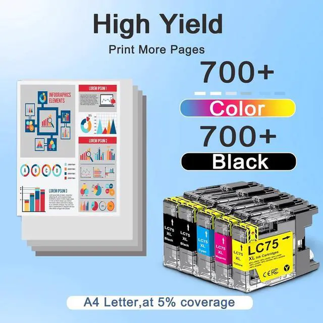 Dramatic Cost Saving - Total 3,500 Pages: Slash your printing costs by up to 70%!Each color cartridges yields up to 700 pages and each black cartridges yields up to 700 pages, this lc75xl-5pk ink cartridges delivers a massive 3,500 pages - ideal for large-scale printing needs in homes, offices and schools, and at an affordable price