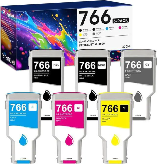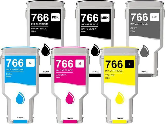 Package includes: 1 x 766 photo black ink cartridge (3ED55A), 1 x 766 matte black ink cartridge (3ED57A), 1 x 766 gray ink cartridge (P2V93A), 1 x 766 cyan ink cartridge (P2V89A), 1 x 766 magenta ink cartridge (P2V90A), 1 x 766 yellow ink cartridge (P2V91A) replacement for HP DesignJet 766 ink cartridges, 766 ink cartridge, 766 black ink, 766 color ink.