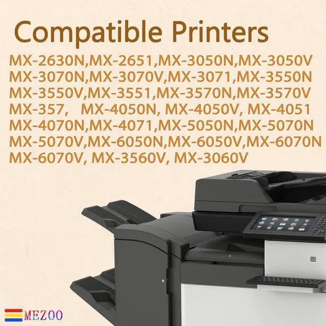MX61NT Toner Compatible printers: MX-2630N, MX-2651, MX-3050N, MX-3050V, MX-3070N, MX-3070V, MX-3071, MX-3550N, MX-3550V, MX-3551, MX-3570N, MX-3570V, MX-357, MX-4050N, MX-4050V, MX-4051, MX-4070N, MX-4071, MX-5050N, MX-5070N, MX-5070V, MX-6050N, MX-6050V, MX-6070N, MX-6070V, MX-3560V, MX-3060V printer