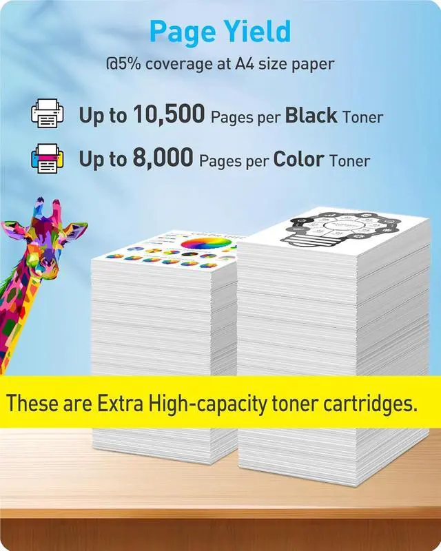 Exceptional Page Yield: Delivers an impressive output of up to 10,500 pages from the black cartridge and up to 8,000 pages from each color cartridge, based on 5% coverage on A4 paper.