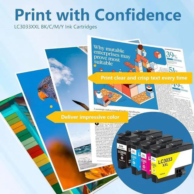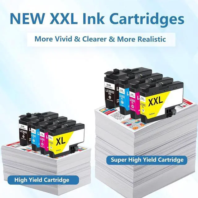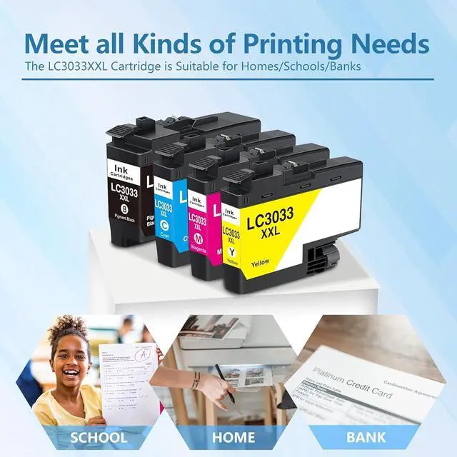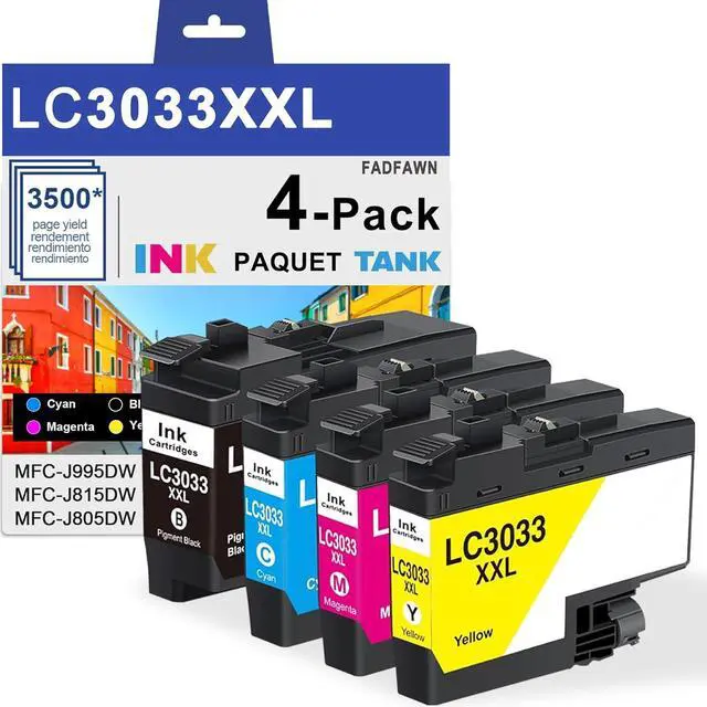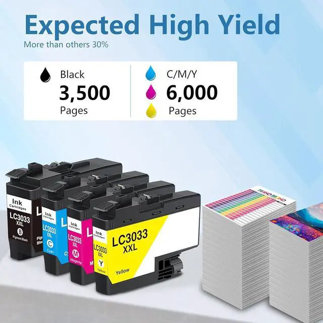 Package ContentsCompatible for brother ink lc3033 includes 1 x LC3033 Black Ink Cartridge XXL, 1 x LC3033 Cyan XXL Cartridge, 1 x LC3033 Yellow XXL Cartridge, 1 x LC3033 Magenta XXL Cartridge