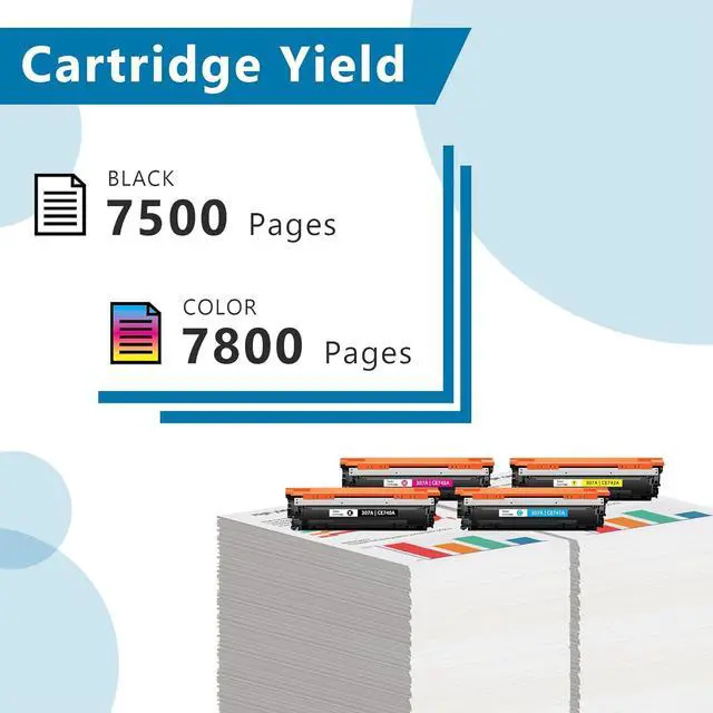 High Page Yield: Up to 7,500 Pages per 307A black toner, 7,800 Pages per 307A cyan toner, 7,800 Pages per 307A yellow toner, 7,800 Pages per 307A magenta toner (Letter/A4, at 5% Coverage)