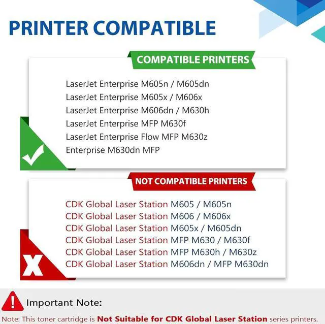 Compatible with:Laser Enterprise M605n M605dn M605x M606dn M606x M630h; Enterprise M630dn MFP; Laser Enterprise MFP M630f, Flow MFP M630z; M605 M606, M630 MFP; Laser Managed M605, MFP M630 Printer