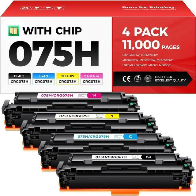 Package Includes: 4-Pack 075H CRG-075H Compatible Toner Cartridge Replacement for Canon 075H Toner Cartridge (1 x 075H black toner, 1 x 075H cyan toner, 1 x 075H yellow toner, 1 x 075H magenta toner).