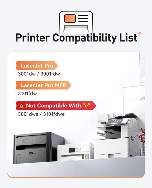 Compatible Printer: Compatible with HP LaserJet Pro 3001dw 3001fdw HP LaserJet Pro MFP 3101fdw Printer. NOT Compatible for Suffix with Letter "e" such as:Pro MFP 3001dwe mfp 3101fdwe Series Printer.