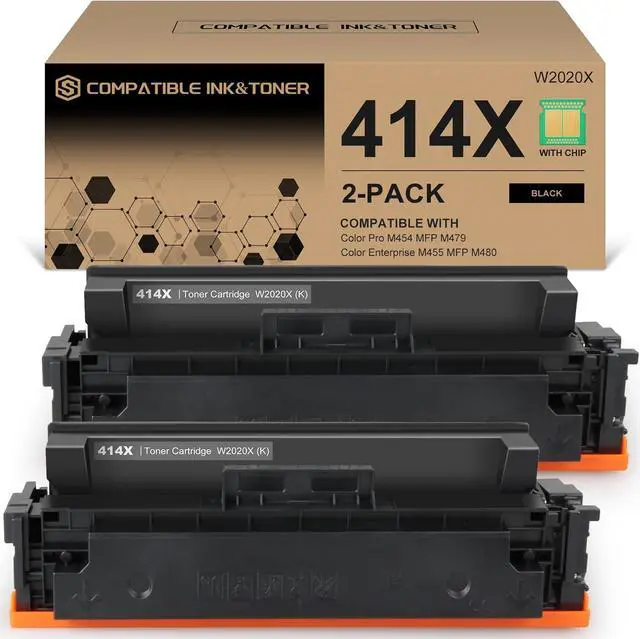 What's in the box: 2-pack 414X black toner cartridges with chip (2 x 414X W2020X black toner) compatible with HP MFP M479fdw M454dw toner.