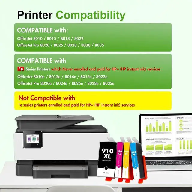 Important Note: 910XL Black and Color Combo Pack are Not compatible with *e series printers enrolled and paid for HP+ (HP instant ink) services