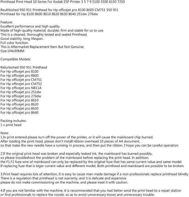 950 951 Printhead Replacement Fit for HP Officejet Pro 8100 8600 8610 8620 8630 8640 251DW 276DW Color Print head