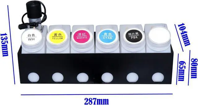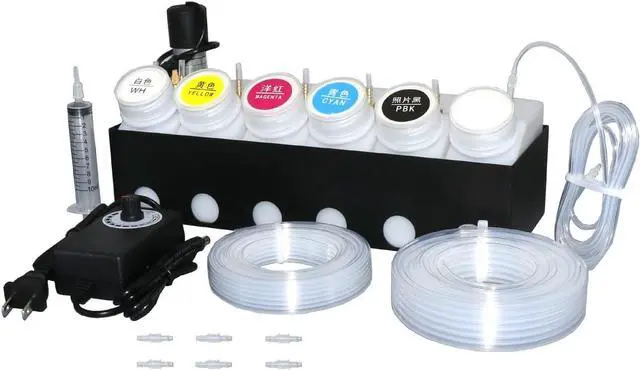 COMPLETE DTF CISS SYSTEM: Universal continuous ink supply system designed for Epson ET8550, ET8500, XP15000, and L1800 DTF printers with 6 bottles (White, Yellow, Magenta, Cyan, Photo Black, and one Waste Ink Tank)