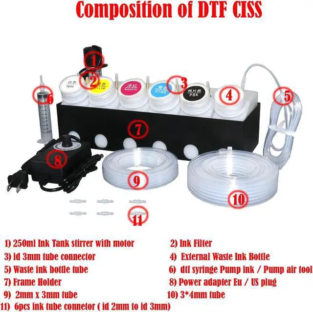 COMPREHENSIVE PACKAGE: Includes 250ml ink tank with motorized stirrer, ink filter, waste ink collector bottle, DTF syringe pump, extension tubes (2mm x 3mm and 3mm x 4mm), 6 tube connectors, and power adapter with US plug