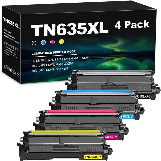 Included in the package are four TN635xl toner cartridges: black, cyan, yellow, and magenta( tn635y tn635m tn635c tn635bk ).