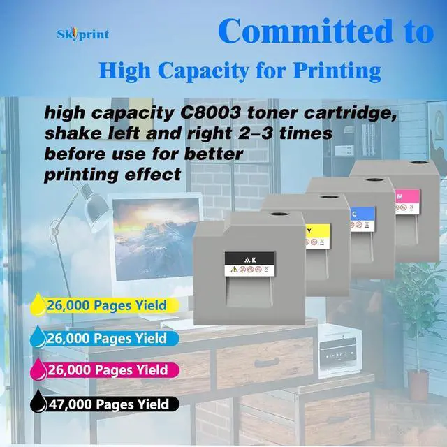 SkyPrint MP C8003 toner cartridges come with intelligent chips that automatically recognize and provide printing, Not damaging the machine Shake the toner cartridge horizontally 2-3 times before use to evenly distribute the toner,providing you with better clear and natural printing effects