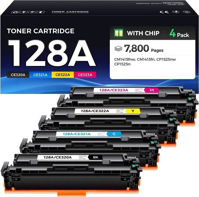 Package Contains: 4 Packs toner cartridges (128A CE320A Black / 128A CE321A Cyan / 128A CE322A Yellow / 128A CE323A Magenta).