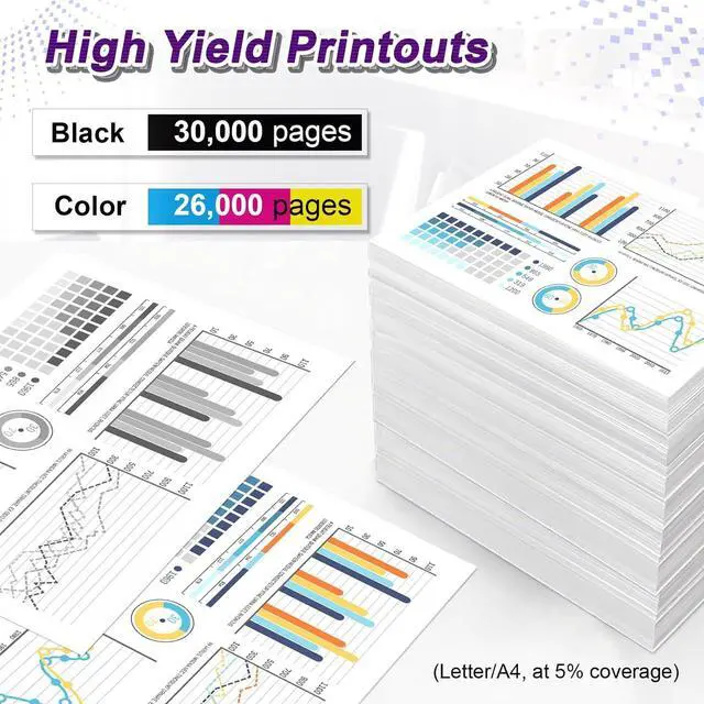 High yield: Our toner cartridge black has a high yield of 30,000 pages and color has a high yield of 26,000 pages to reduce the frequency of cartridge replacements, saving you time and money in the long run, and is cost-effective, with five percent coverage