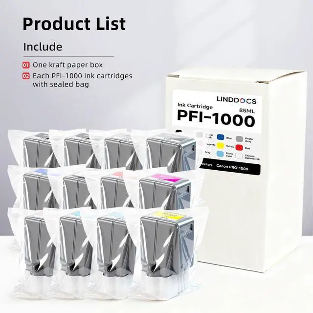 Package Includes: 12 Pack-PFI-1000 Ink Cartridges (MBK, PBK, C, M, Y, R, GY, B, PGY, PC, PM, CO)