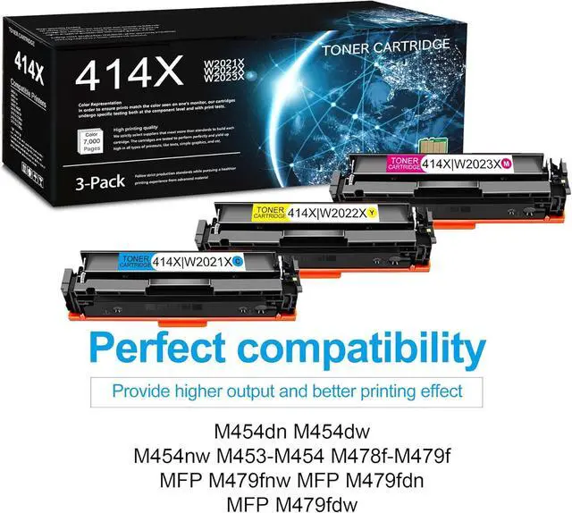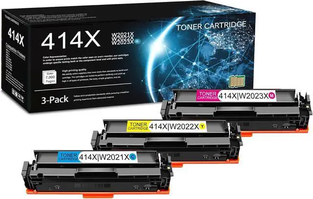 Include: 3 Pack 414X Toner Cartridges Compatible for 1 Cyan(W2021X),1 Yellow(W2022X),1 Magenta(W2023X) Toner Cartridge.
