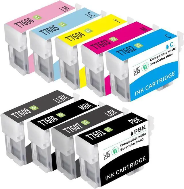 Page Yield and Content: T7601|Photo Black 285ML, T7602|Cyan 285ML, T7603|Vivid Magenta 285ML, T7604|Yellow 285ML, T7605|Vivid Light Magenta 285ML, T7606|Light Cyan 285ML, T7607|Light Black 285ML, T7608|Matte Black 285ML, T7609|Light Light Black 285ML, each color with 1250 page yield.