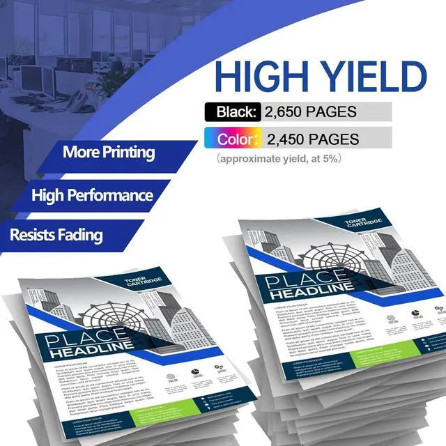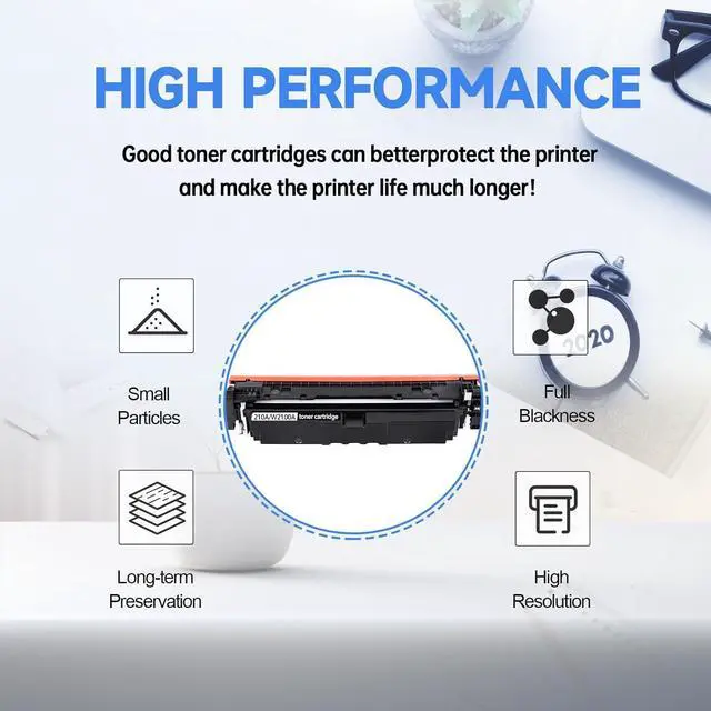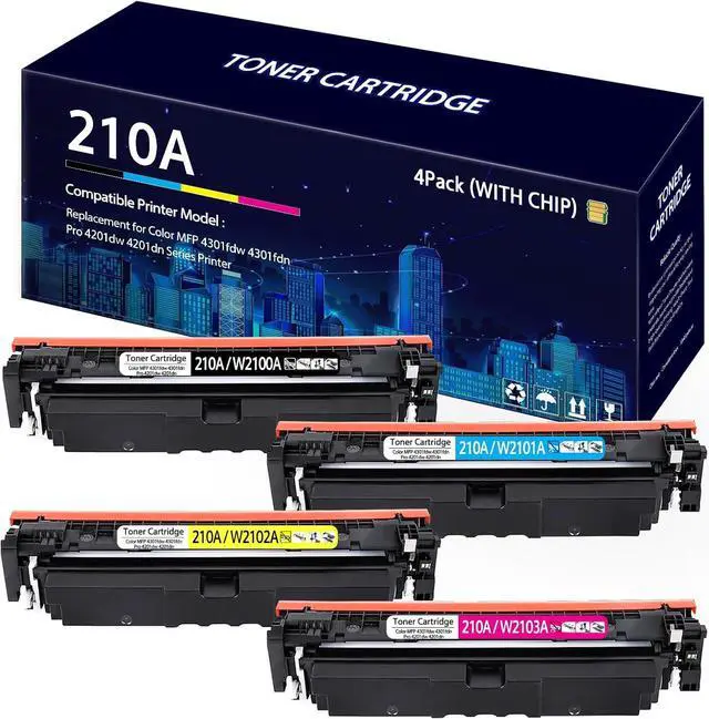 Latest Chip: 210A toner cartridges adopt latest upgraded chip for instant recognition by printers and perfect compatibility Page Yield: Up to 2000 pages for 210A W2100A black toner cartridge and 1800 pages for 210A W2101A W2102A W2103A color toner cartridge Compatible Printer Model List: the set of 4 pack 210a toner cartridges is compatible with Color Pro MFP 4301dw, 4301fdw, 4301dn, Color Pro 4201dn, 4201dw Premium Printing Quality: vibrant color and sharp text printing, no fading, no powder leakage and no streaks Easy Installation & Wide Application: the 210A toner is convinent and fast installation and which can be applied to office, school, home, bank, etc