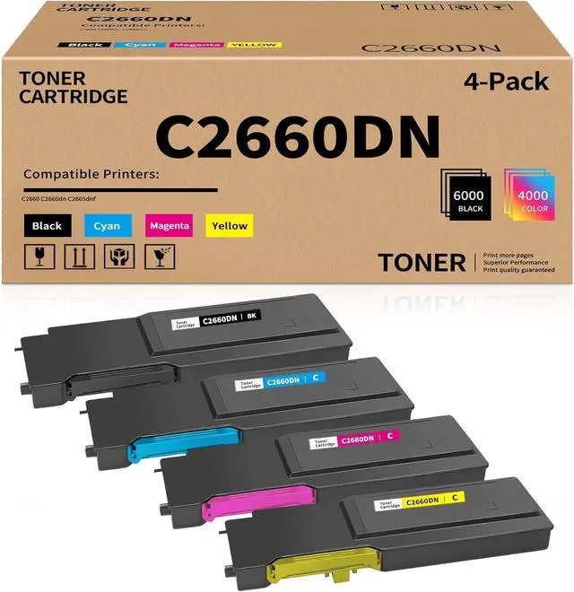 Package Contents: 4 Pack High Yield C2660DN Toner Cartridge Compatible Replacement for Dell C2660DN 593-BBBU 593-BBBT 593-BBBS 593-BBBR ( 1 Black +1 Cyan +1 Magenta +1 Yellow )