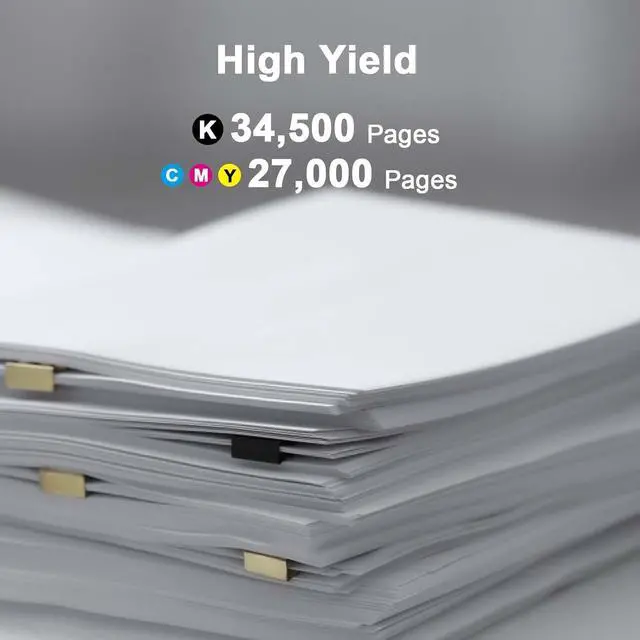 Page Yield: Black is 34,500 pages, Color is 27,000 pages per cartridge at 5% coverage.