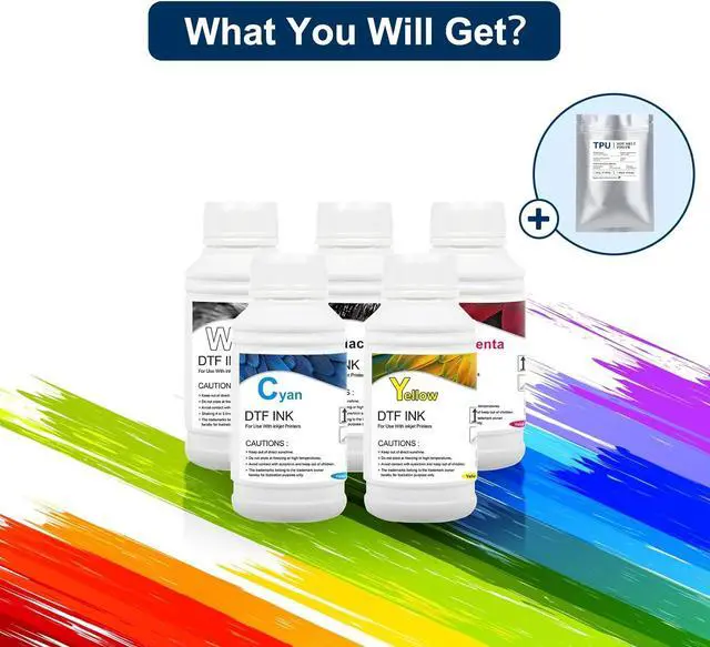 Complete Package: Includes 5×250ml CMYKW ink bottles and 500g DTF powder for your dtf printer, backed by prompt customer support for satisfaction.