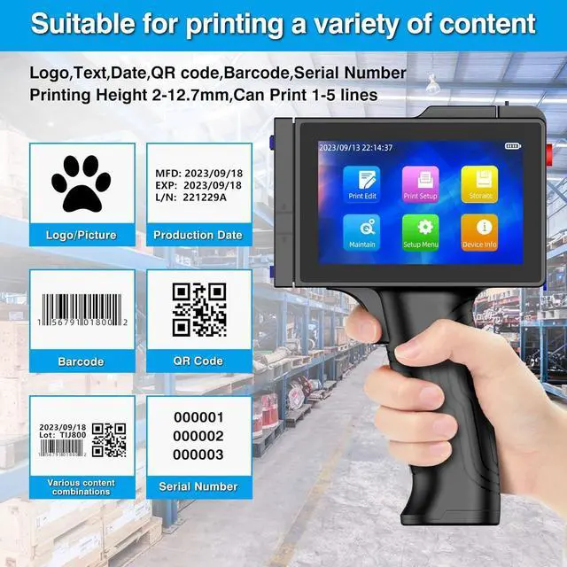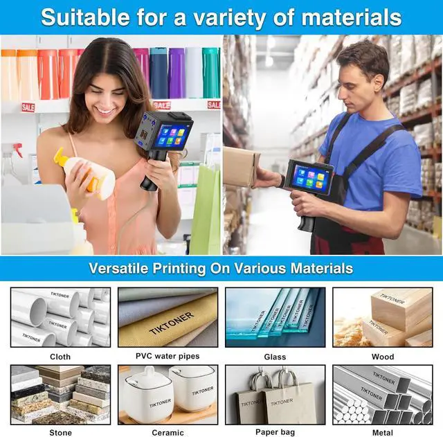 Versatile Printing Content & Wide Application TIKTONER TIJ800 handheld printer gun is capable of printing various contents, including production date, expired date, text, contact methods, product information, website address, serial number, barcode, logo, QR code, label etc. Handheld inkjet printer gun is great tool for many applications, such as beverage, building materials, electronics, daily cosmetics, manufacture, warehouse, packaging etc.