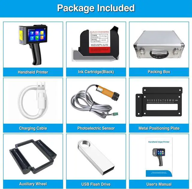 Suitable for Automatic Production Line & Package In order to improve batch coding efficiency, this TIJ800 handheld inkjet coding machine can use on the assembly line to achieve automatic inkjet printing. ( Package: 1× Handheld Inkjet Printer, 1× Sheet Metal Locator, 1× Charging Line, 1× U-disk, 1× Ink cartridge(Black), 1× Auxiliary wheel, 1× Instruction book, 1x Portable Case.)