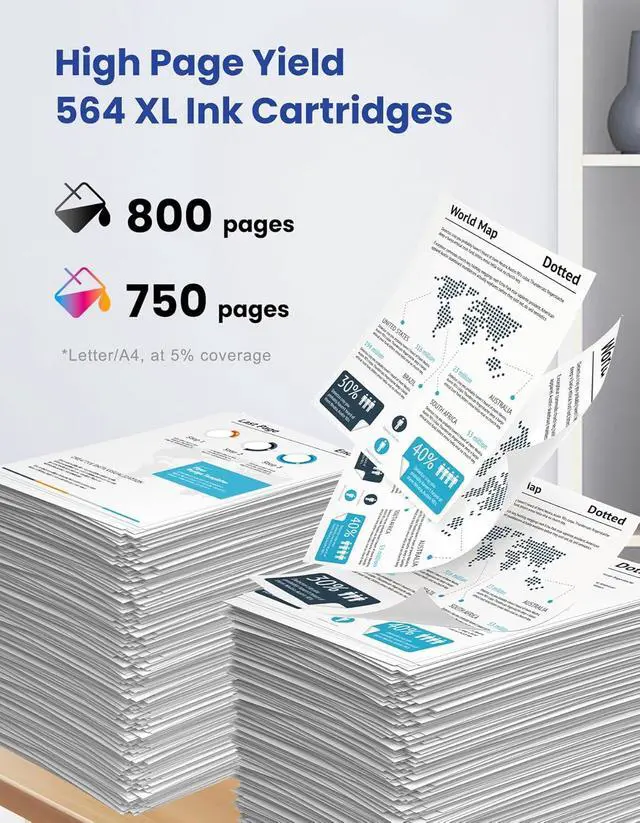 Exceptional Page Yield: 800 Pages per 564 XL Black Ink Cartridges; 750 Pages per 564 Cyan, Magenta, Yellow Ink Cartridges, at 5% coverage at A4 paper