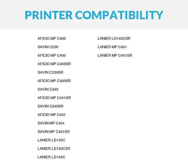 For Use In: Aficio MP C300, Aficio MP C300SR, Aficio MP C400, Aficio MP C400SR, MP C401, MP C401SR, LD130C, LD130CSR, LD140C, LD140CSR, MP C401, MP C401SR, C230, C230SR, C240, C240SR, MP C401, MP C401SR