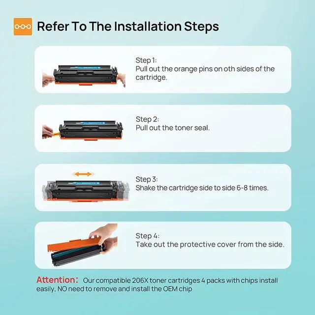 With CHIPOur Compatible 206X Toner Cartridges for HP 206X 206A Toner Cartridges with Newest Chips and Install Easily, NO Need to Remove and Install the Chip of OEM 206X 206A Toner Cartridges.