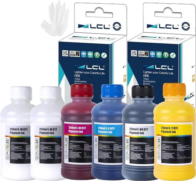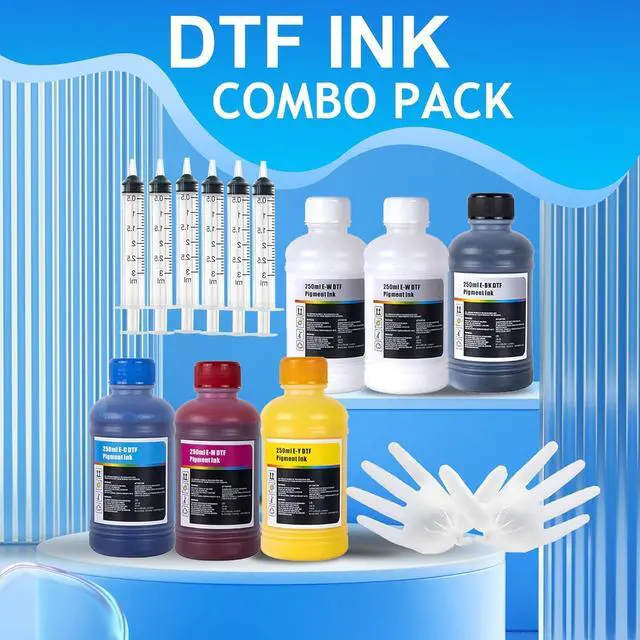 Package Includes: 6 DTF ink cartridges. Capacity: 250ml/Piece. (White x 2, Black x 1, Cyan x 1, Magenta x 1, Yellow x 1) ,Instruction x 1, Glove x6, Syringe x6