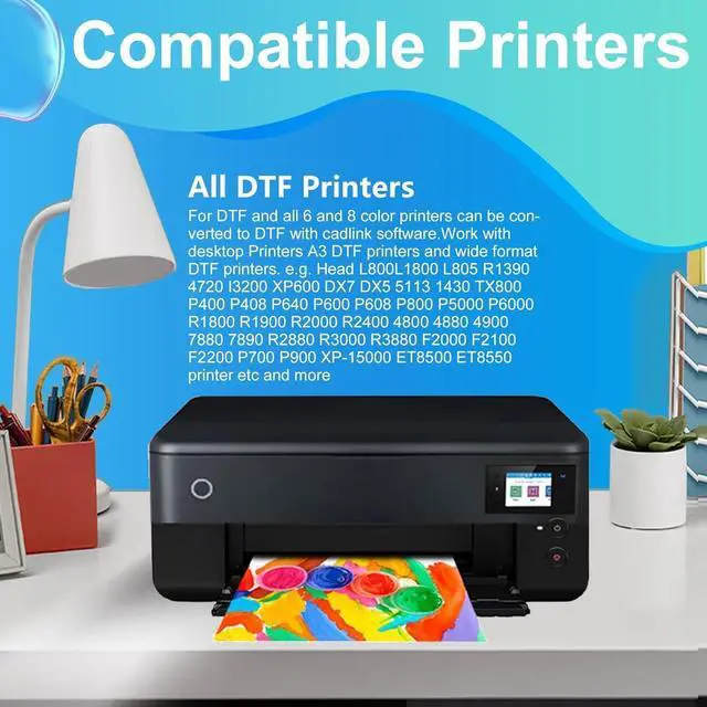 Wide Compatibility: Compatible for DTF and all 6 and 8 color printers can be converted to DTF with cadlink software. Work with desktop Printers, A3 DTF printers, and wide format DTF printers. e.g. Head L800,L1800, L805, R1390, 4720, I3200, XP600, DX7, DX5, 5113, 1430, TX800P400, P408, P640, P600, P608, P800, P5000, P6000R1800, R1900, R2000, R2400, 4800, 4880, 4900, 7880, 7890, R2880,R3000, R3880, F2000, F2100, F2200, P700, P900, XP-15000 ET8500, ET8550 printer etc and more